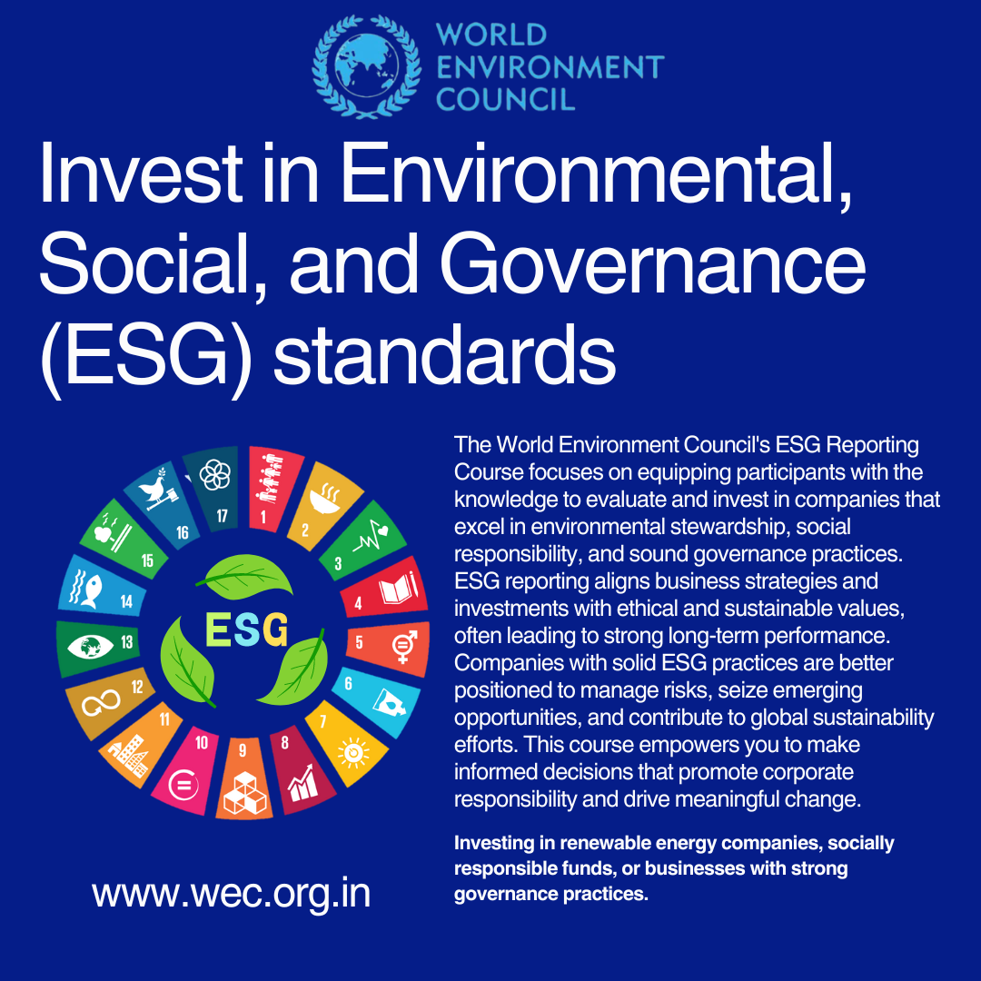 The World Environment Council (WEC) is committed to advancing global sustainability through focused Environmental, Social, and Governance (ESG) initiatives. As part of our campaign, ESG Goals by 2030, we aim to foster a more resilient and sustainable future by making meaningful change across key ESG areas. Our vision is to align with the United Nations' Sustainable Development Goals (SDGs) and contribute to creating a responsible and sustainable world.